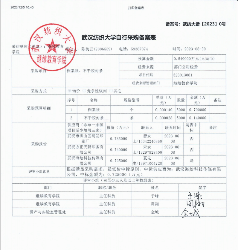 太阳成集团tyc122ccvip自行采购备案表(档案袋、不干胶封条)