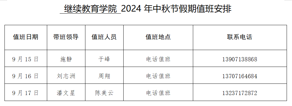 tyc122cc太阳成集团 2024年中秋节假期值班安排