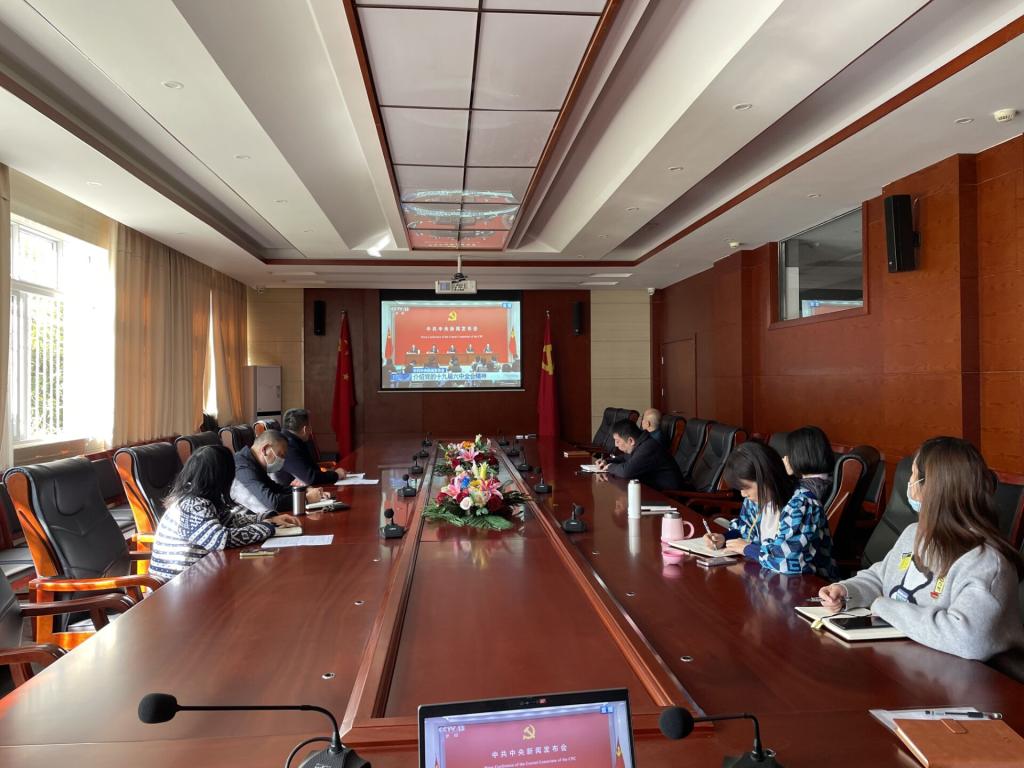 11月12日上午,tyc122cc太阳成集团、中欧中心全体职工在南湖会议中心集中观看了中共中央党的十九届六中全会新闻发布会。
