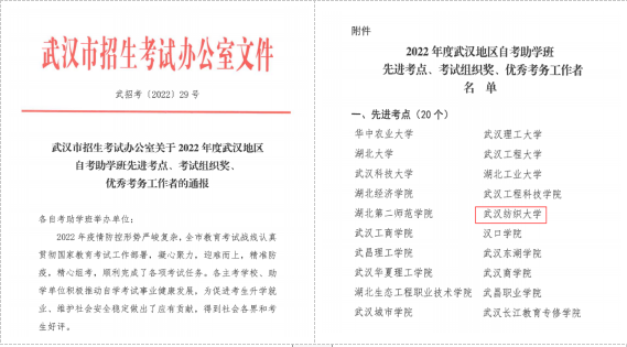 近日,武汉市招生考试办公室发布《关于2022年度武汉地区自考助学班先进考点、考试组织奖、优秀考务工作者的通报》(武招考〔2022〕29号),我校被评为自考先进考点,自考办主任张娟同志被评为优秀考务工作者。