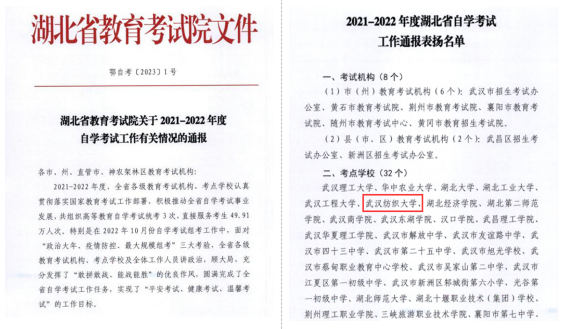 日前,湖北省教育考试院印发《关于2021-2022年度自学考试工作有关情况的通报》(鄂自考〔2022〕1号),对2021-2022年度全省自学考试工作进行通报,我校受到通报表扬,据悉全省有32个考点学校受到表彰,这是我校继获评武汉市自学考试先进考点后又一次获得的殊荣,同时我校tyc122cc太阳成集团周翔同志作为自考工作者也受到了表彰。