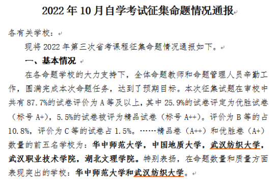 近日,湖北省教育考试院发布了《2022年10月自学考试征集命题情况通报》,对2022年第三次省考课程征集命题情况进行了通报,我校在精品卷(A++)和优胜卷(A+)数量上名列第三,尤其是在命题数量和质量方面表现突出,得到了省教育考试院特别表扬。