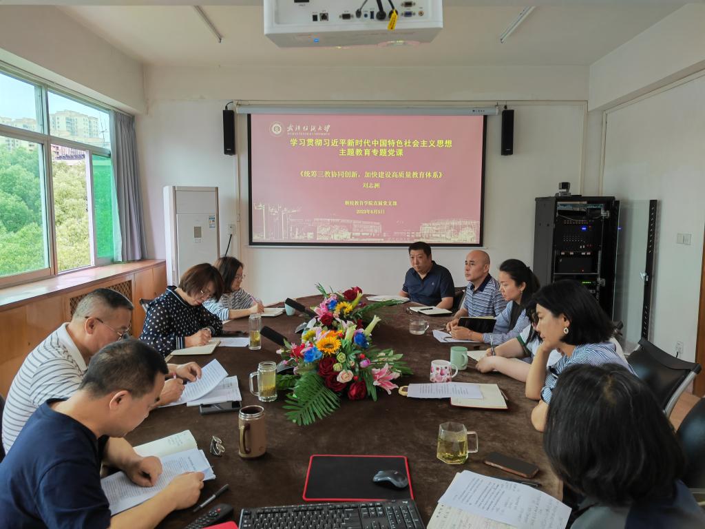 根据学校主题教育统一部署和工作要求,6月5日上午,tyc122cc太阳成集团副院长刘志洲在东湖校区行政楼512会议室为学院全体党员干部讲了一堂题为《统筹三教协同创新,加快建设高质量教育体系》的专题微党课。会议由tyc122cc太阳成集团直属党支部书记秦梦主持。