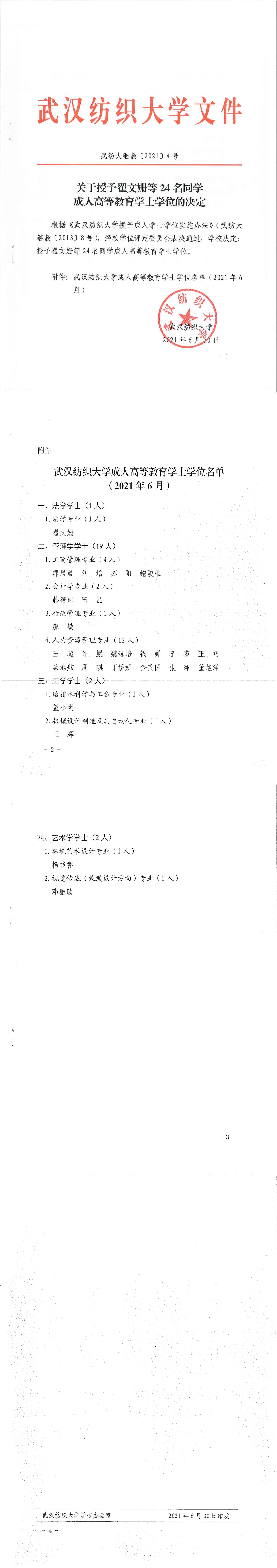 关于授予翟文姗等24名同学成人高等教育学士学位的决定