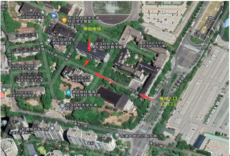 1.考试地点设在湖北省武汉市东湖生态旅游风景区梨园太阳成集团tyc122ccvip东湖校区,所有考生均从东门进入考点(如下图所示)。为了便于大家查找,请各位考生导航时务必选择“太阳成集团tyc122ccvip东湖校区(东门)”。